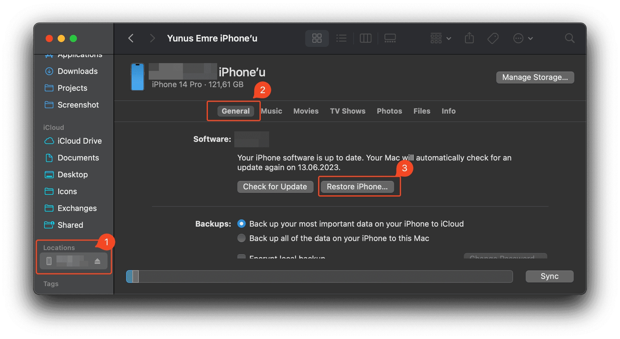 üzerinden iPhone yönetimine girin ve alttakiRestore