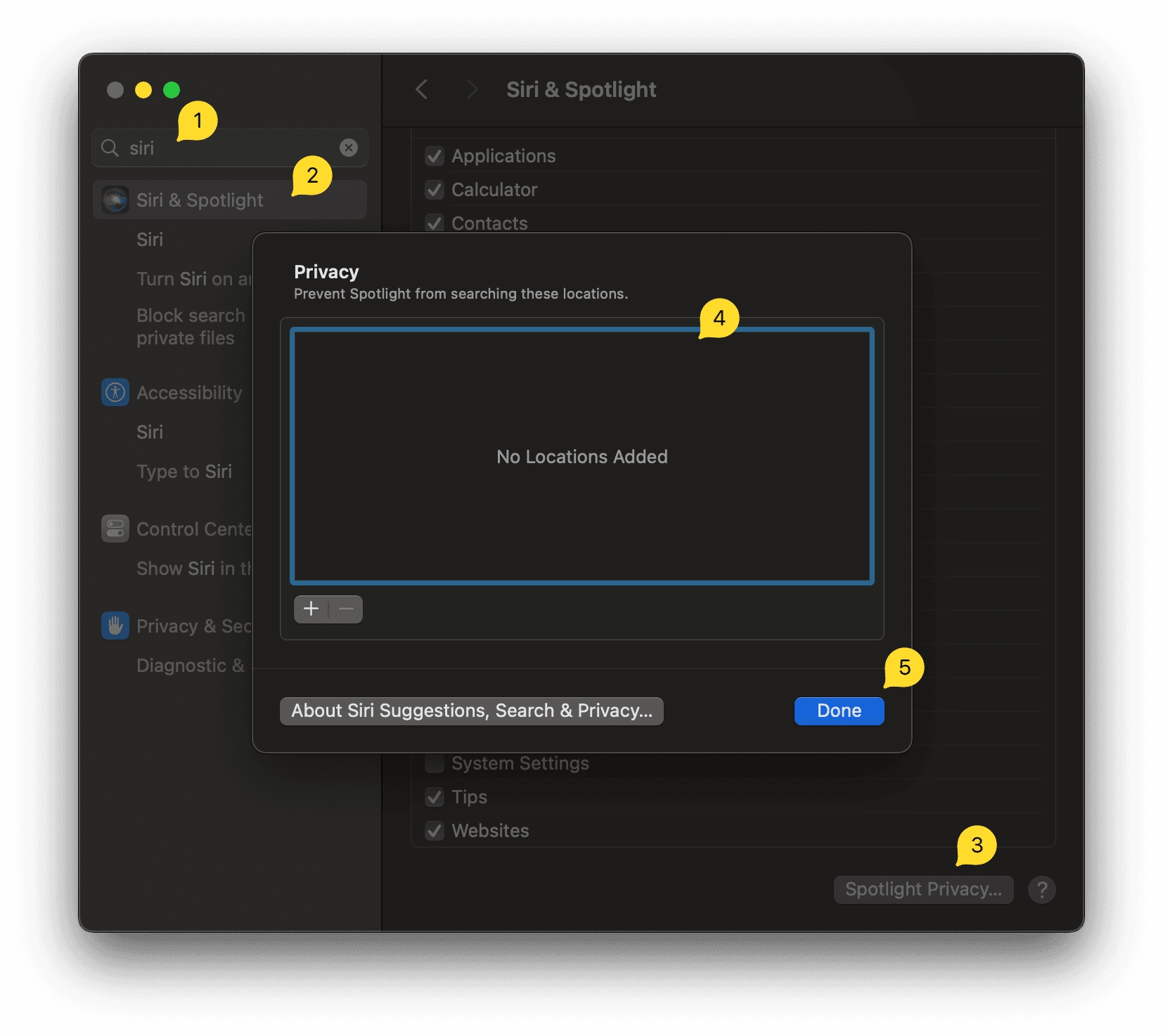 On your Mac, choose Apple menu > System Settings, then click Siri & Spotlight in the sidebar. (You may need to scroll down.) Click Spotlight Privacy in the lower right